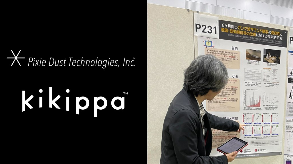 ダイバーシティ&ヘルスケア領域での研究開発と事業化に取り組むピクシーダストテクノロジーズ株式会社(本社:東京都中央区、代表取締役会長CEO:落合 陽一、代表取締役社長COO村上 泰一郎、以下「PxDT」)と、SOMPOひまわり生命保険株式会社(代表取締役社長CEO:大場 康弘、以下「HL」)は、シオノギヘルスケア株式会社が販売するテレビスピーカー「kikippa(ききっぱ)」を用いたHLの保険契約者およびウォーキングアプリ「aruku with SOMPOひまわり生命」(当時Linkx aruku(リンククロス アルク))利用者を対象とした、6か月間の受容性探索実験に関する研究(以下「本研究」)の成果を、第43回日本認知症学会学術集会において発表しました※1。本研究は、塩野義製薬株式会社と連携して実施され、自宅環境でのガンマ波サウンドの受容性と認知機能改善の可能性が探索されました。