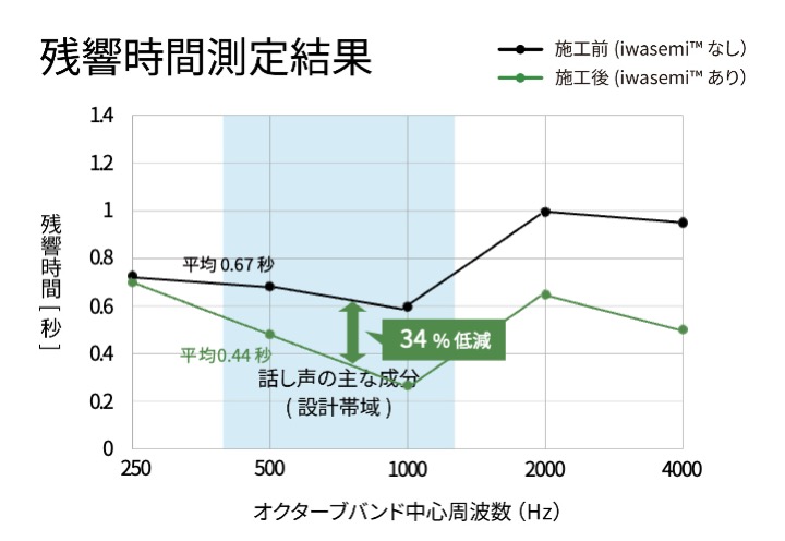 実際にiwasemi™を設置した空間では、人の話し声の主な成分となる帯域で、34%の削減効果が見られました。例えるならば、”ざわついたカフェ”が”静かな図書館”に変わったような“音の静けさ”を体感できます。反響音の指標となる残響時間も0.6秒以下へと抑えることが可能で、国際的な認証制度「WELL認証」においても加点対象となる水準です。